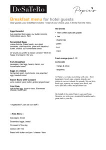 At DeSaTeRo Popie’s, you won’t find a classic hotel buffet – no mediocre breakfasts, but an honest full-service brunch. We bake fresh pastries for you every morning, make a selection of coffee and squeeze fresh juices.