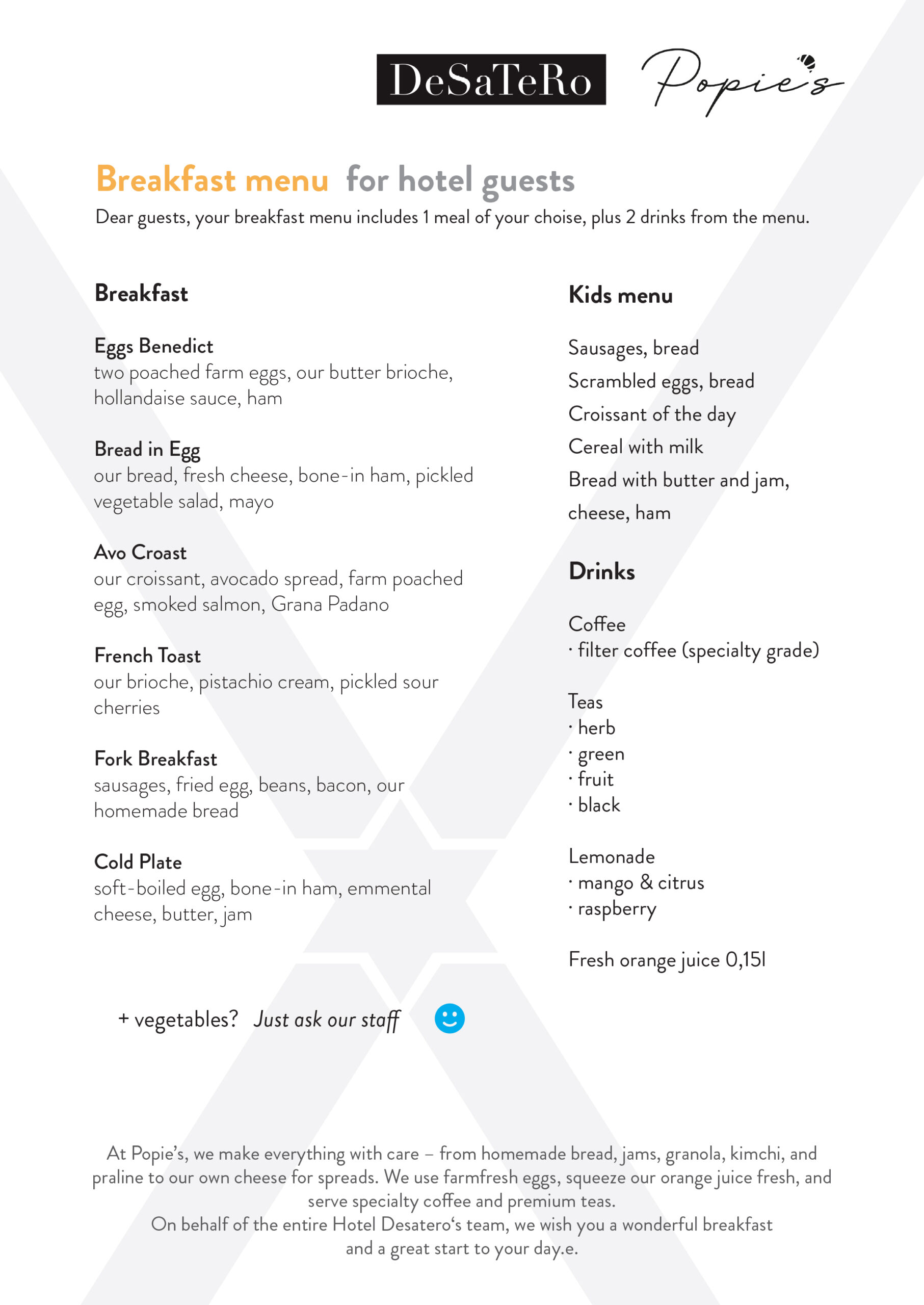 At DeSaTeRo Popie’s, you won’t find a classic hotel buffet – no mediocre breakfasts, but an honest full-service brunch. We bake fresh pastries for you every morning, make a selection of coffee and squeeze fresh juices.